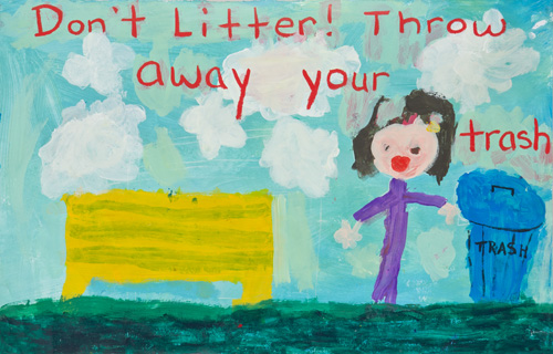 Katherine Elizabeth Ehlers 1st Grade “Don’t Litter! Throw Away your Trash” 14 x 22 inchesAcrylic on paper Mt Washington Castle Connections After School Program
