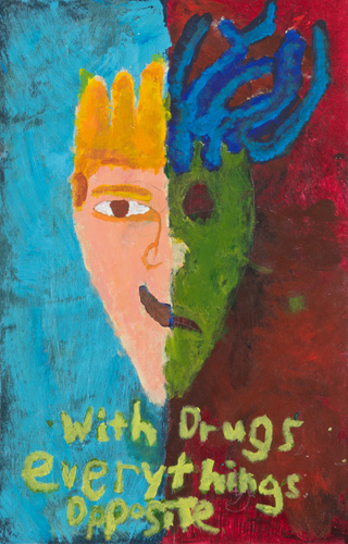 Jackson Lark 5th Grade “ With Drugs Everything is Opposite” 22 x 14 inches Acrylic on paper Mt Washington Castle Connections After School Program