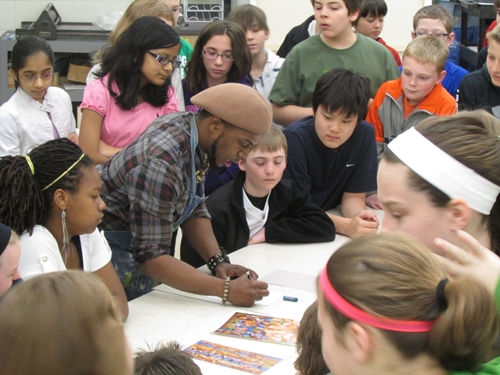 It was an honor to return to E.H. Greene Intermediate School as their artist in residence. In the course of one week and 20 classes, had the pleasure of engaging with 5th and 6th graders from art instructors Amy Glazer and Katy Hall’s studios about my work and journey as an artist. In addition to the students learning about my influences and the artists that interest me, we worked on two 4 x 4 foot canvases that were inspired by my latest work. Thank you Principal Philip Hackett and Sycamore school district for inviting back and Most importantly I would like to thank all 800 students that I met, who showed interest in the work I do and made these paintings come to life.